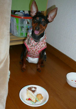 >ケーキを前にしてチャムちゃん、お利口に待ってますね~