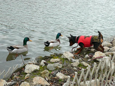 野生のカモは警戒心強くて、すぐに逃げてしまいます、犬連れだと余計にそうです。