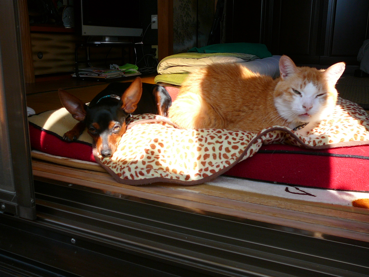 実家の猫たちは日中はどこかへ行ってしまうのですが、うちの、この2匹は日当たり最高のこの場所でずっと寝ているんです。
