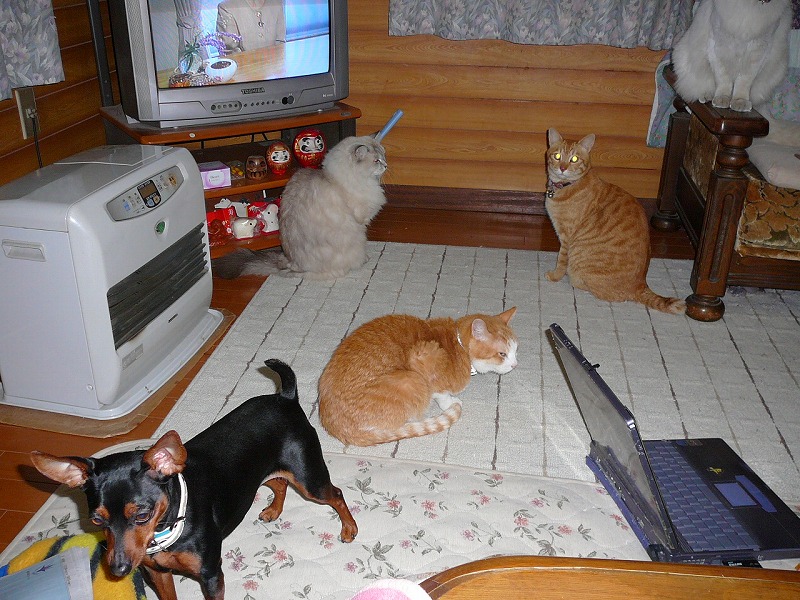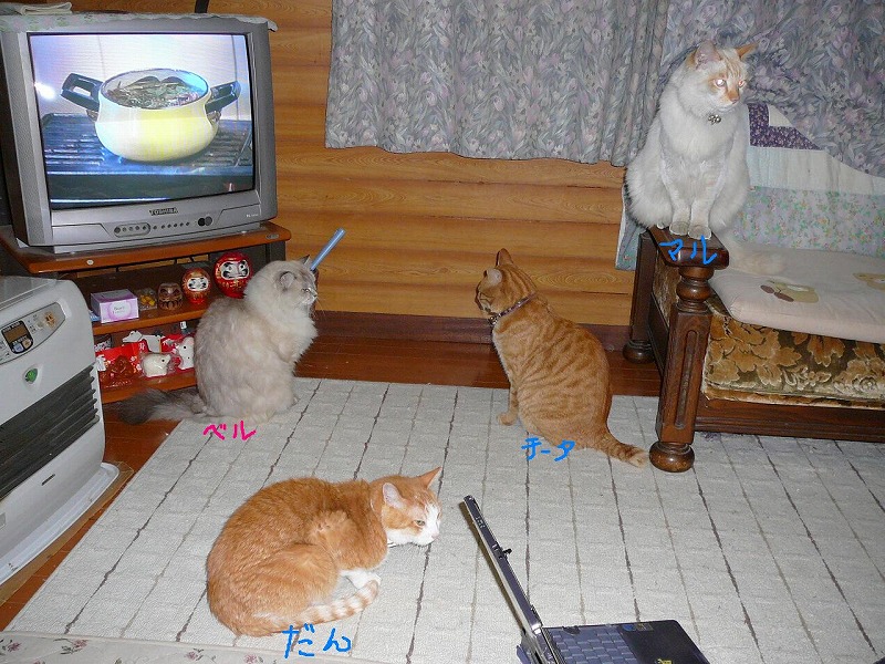 実家の猫たち(ベル チータ マル)とうちのだんちゃん、総勢4匹が珍しく全員集合していたので急いで写真とりました。