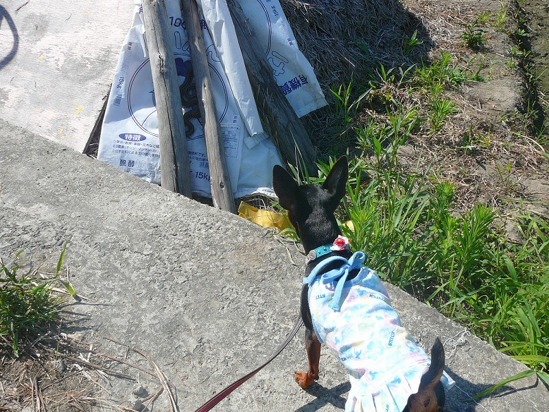 チャムの散歩中、バケツの水の中で何か動いているものを発見!