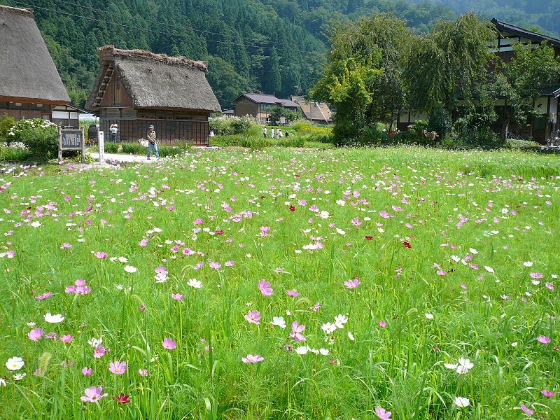 合掌造りの古い家、水路、コスモス畑…