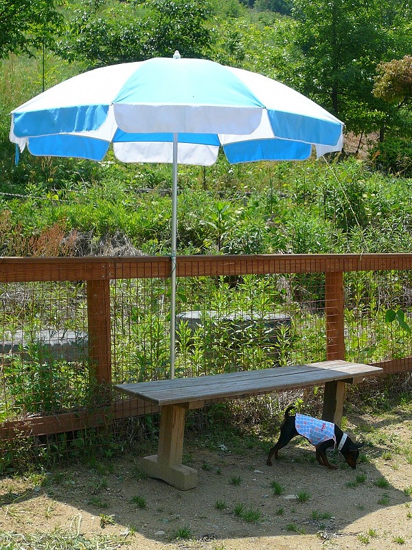飼い主は日差しの下でチャムを呼ぶも、チャムはパラソルの下でくつろいでいて動きません;