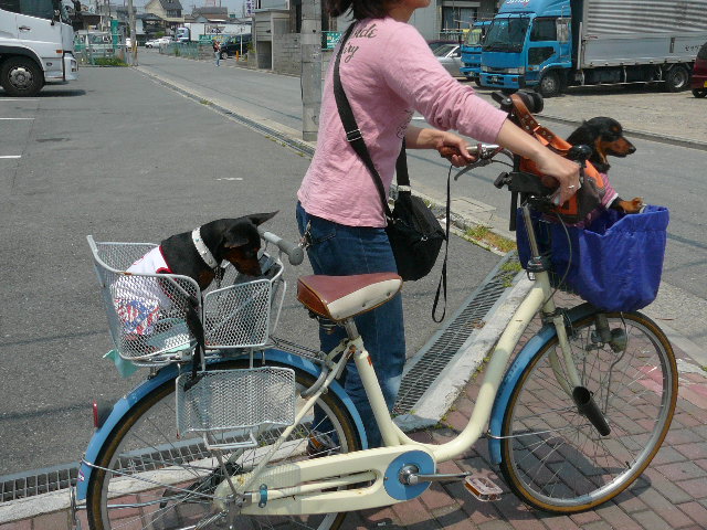 少しだけ歩いて、ワンたちは自転車のカゴに乗せられました、らくち~ん♪