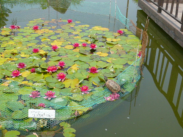 網の上にカメさんが器用に登って日光浴してます。