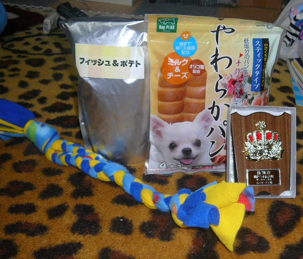 賞品の中に、チャムの大好な、フリース製手作りロープトイが入っていてラッキー