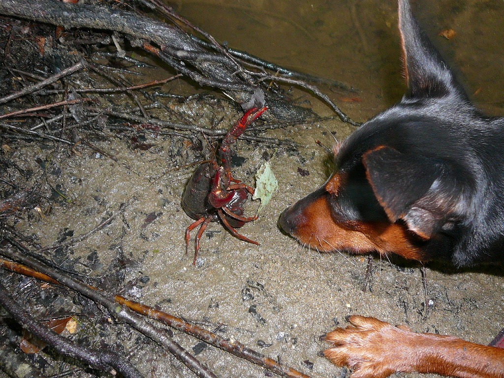 威嚇するザリガニ、チャム、怖くないのかなぁ。
