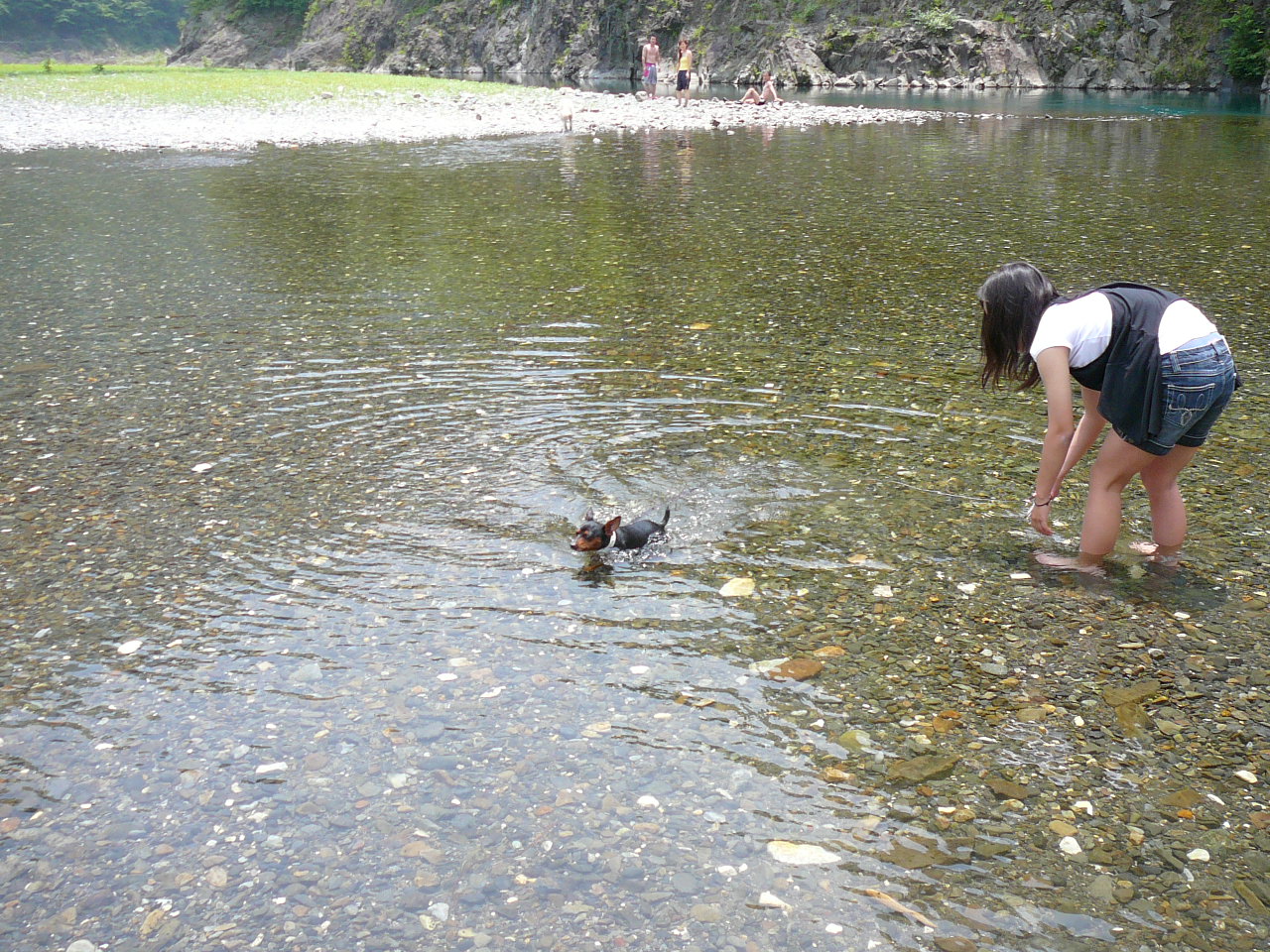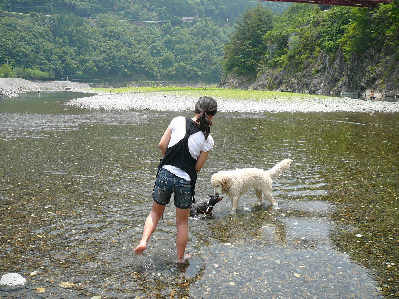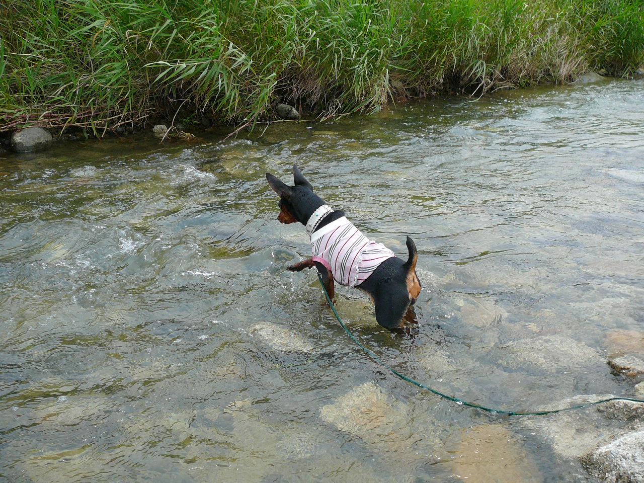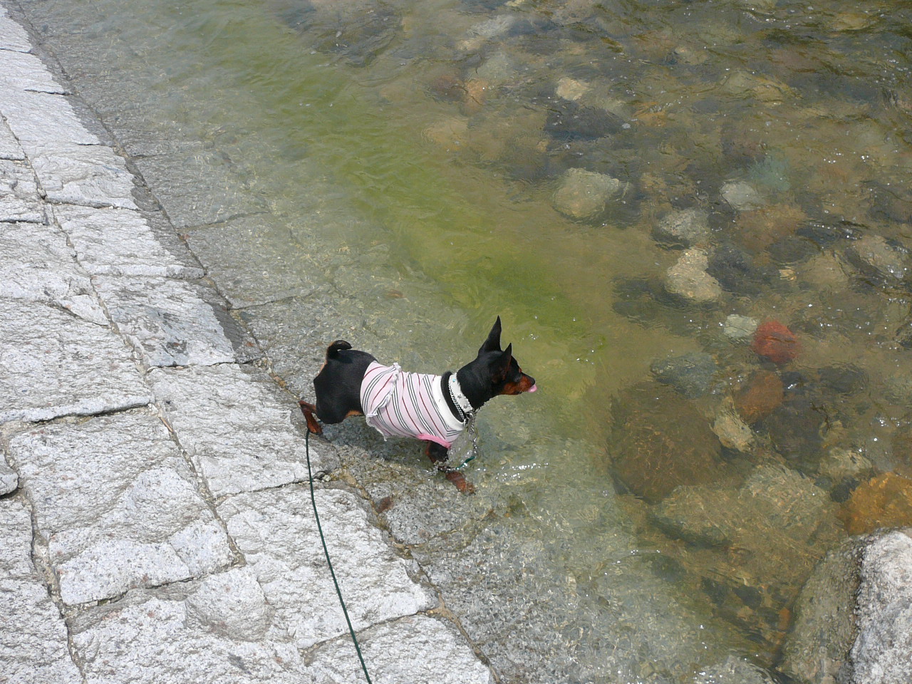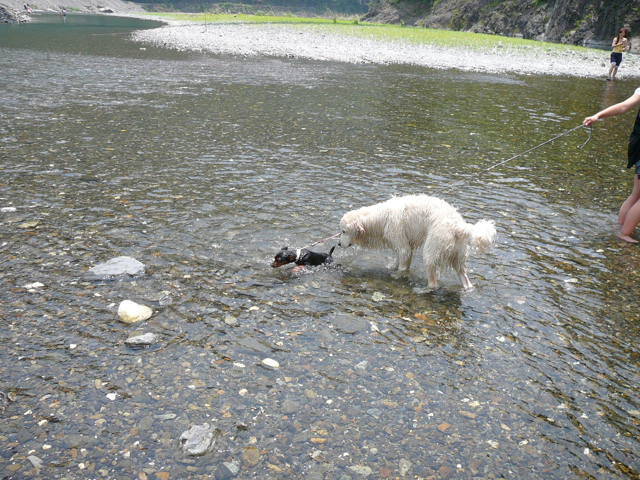 ゴルちゃんは足先のみ浸かっていて余裕、チャムは必死だ~(笑)